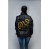 Černá šusťáková bunda na zip se zlato černými motivy na přední i zadní straně.