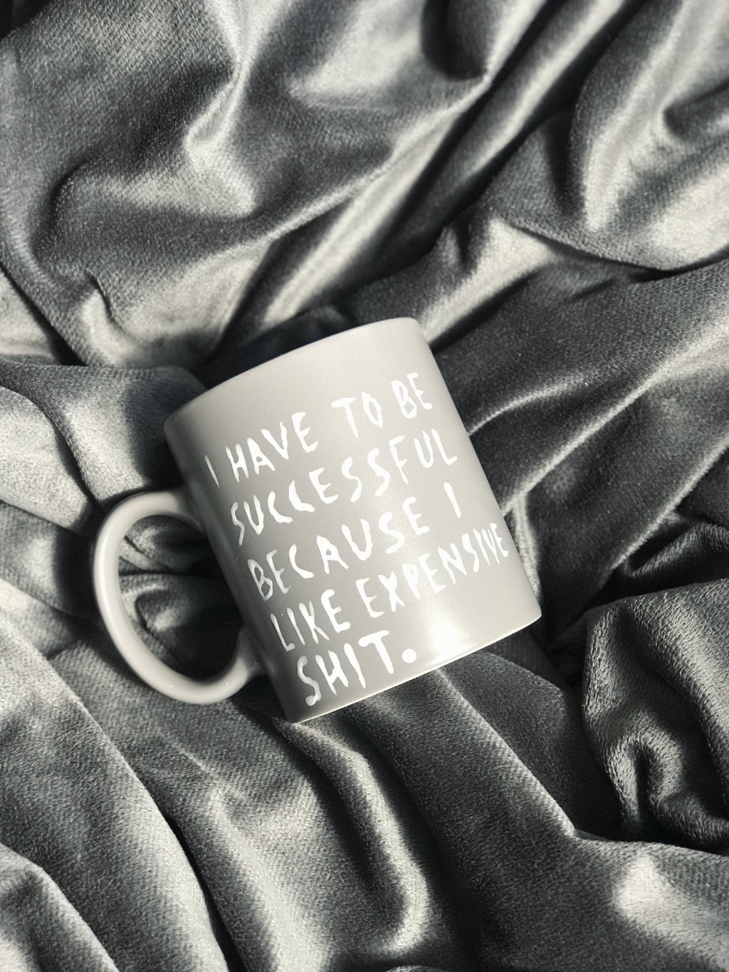 Ručně designovaný arogantní hrnek s nápisem "I HAVE TO BE SUCCESSFUL BECAUSE I LIKE EXPENSIVE SHIT".