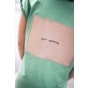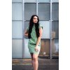 Zelené šaty s koženkovou aplikací na zádech s jasným vzkazem “shit happens”.