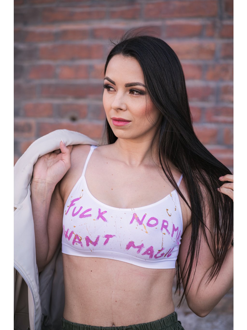 Bílá podprsenka s nápisem “Fuck normal I want magic”.