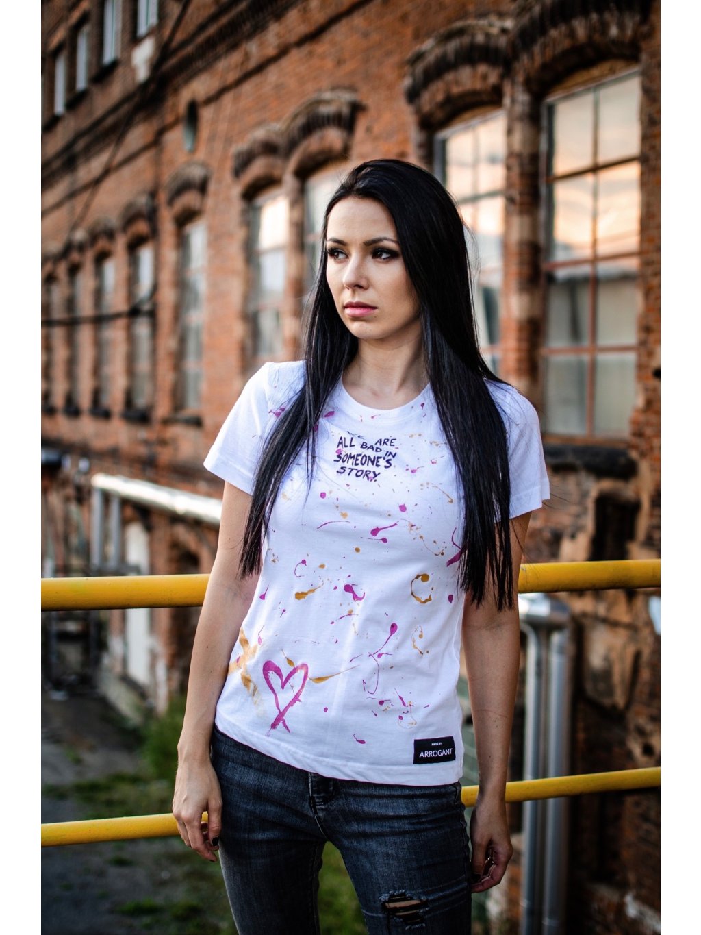 Bílé slimfit tričko ze 100 % bavlny s nápisem nad prsy a motivy cákanců v růžové a zlaté barvě.