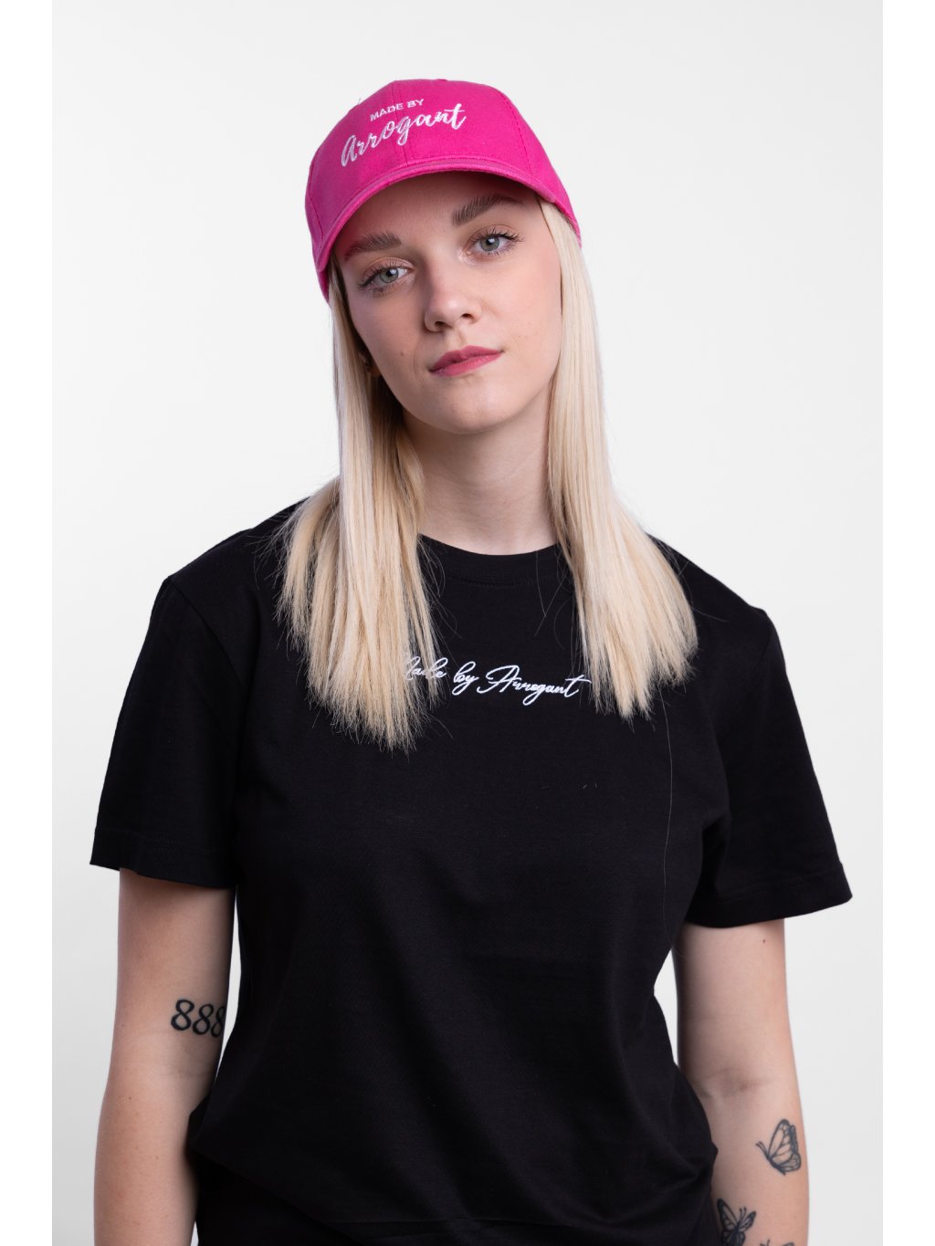 Růžová kšiltovka s bílým vyšitým logem Made by Arrogant a s nastavitelnou velikostí.