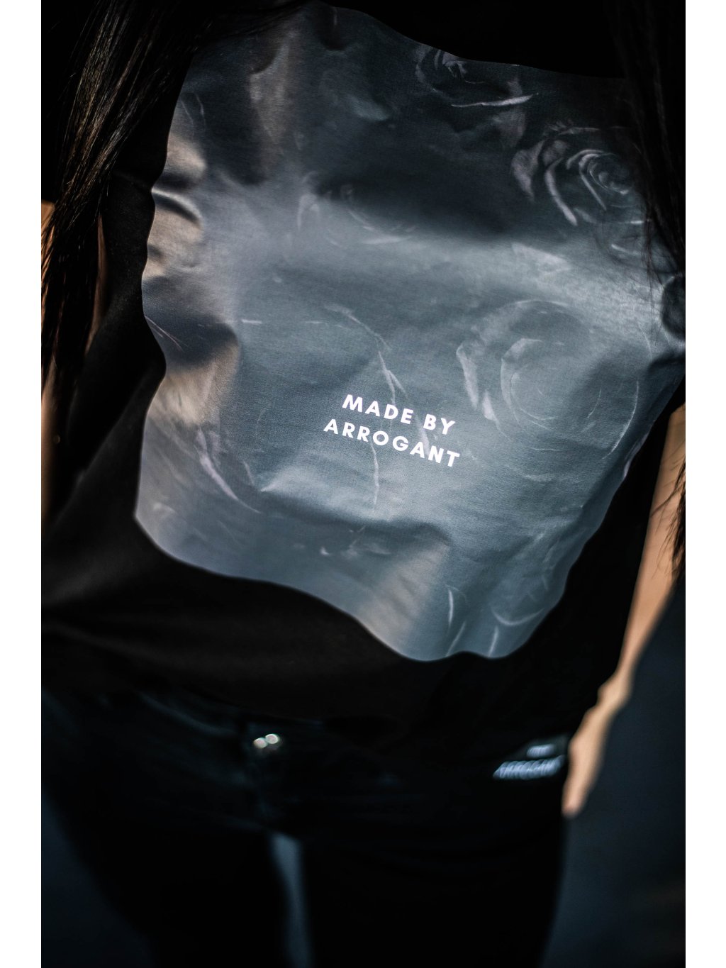 Oversize triko s potiskem s černými růžemi na přední straně.